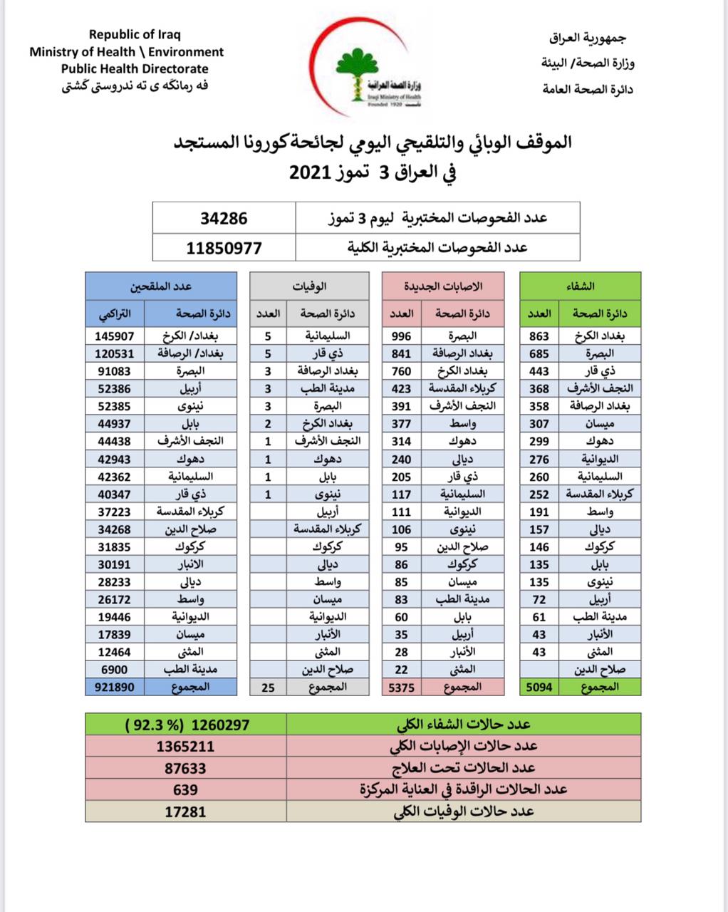 أعلنت وزارة الصحة، اليوم السبت، الموقف الوبائي والتلقيحي اليومي لجائحة كورونا في العراق.