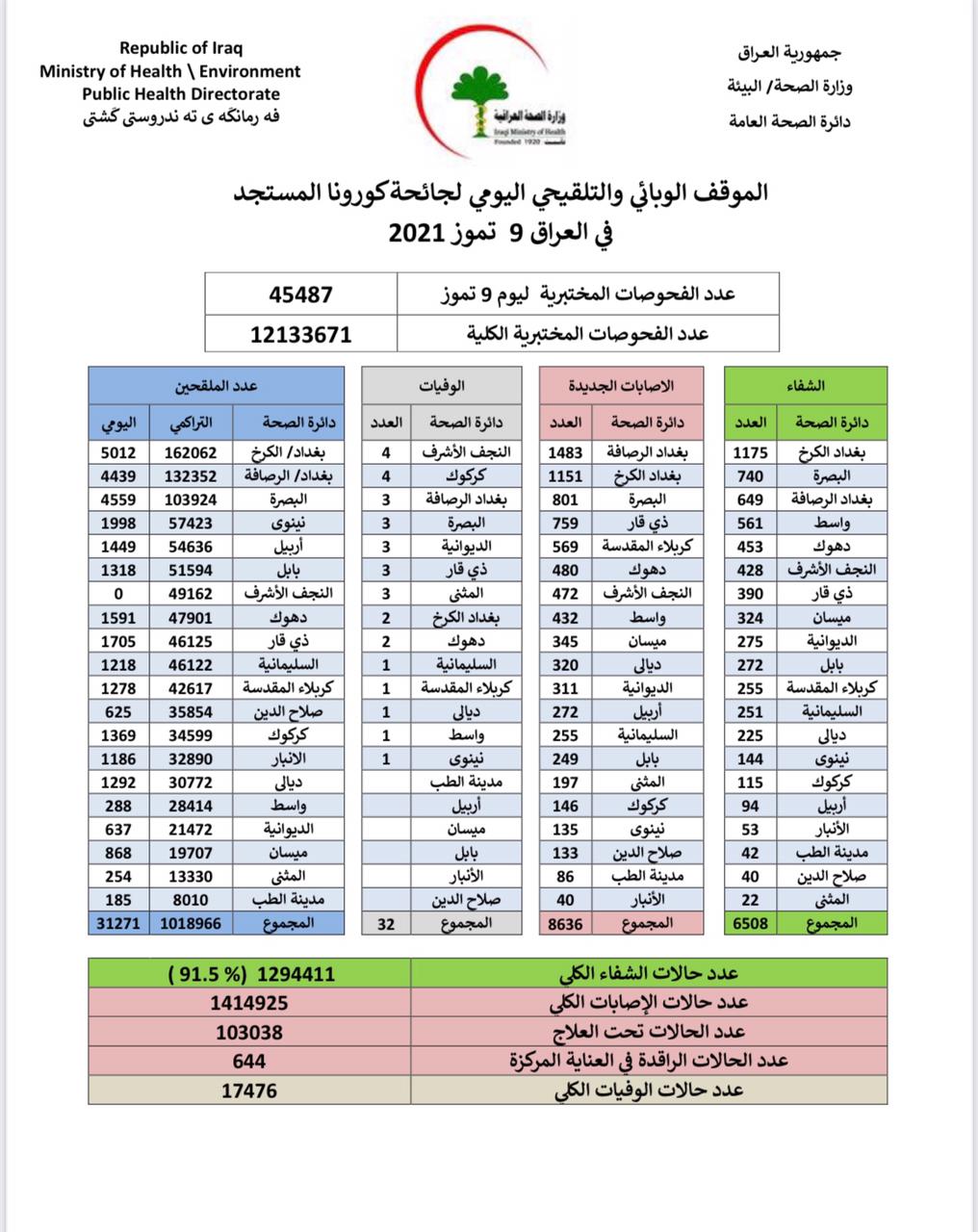وبحسب الموقف الوبائي الصادر عن الوزارة فقد "سجل العراق 8636 اصابة جديدة بفيروس كورونا خلال الـ 24 ساعة الماضية".