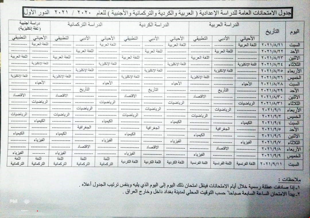 وزارة التربية تعلن عن جدول امتحانات طلبة السادس الاعدادي بفروعه (الاحيائي والطتبيقي والأدبي) للدراسة العربية والمناطق المشمولة بالدراسة الكردية والتركمانية للعام الدراسي 2020 – 2021 (الدور الاول) .