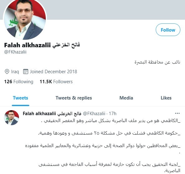 وقال في تغريدة على موقع تويتر ان رئيس الوزراء مصطفى الكاظمي هو من يدير ملف الناصرية بشكل مباشر وهو المقصر الحقيقي