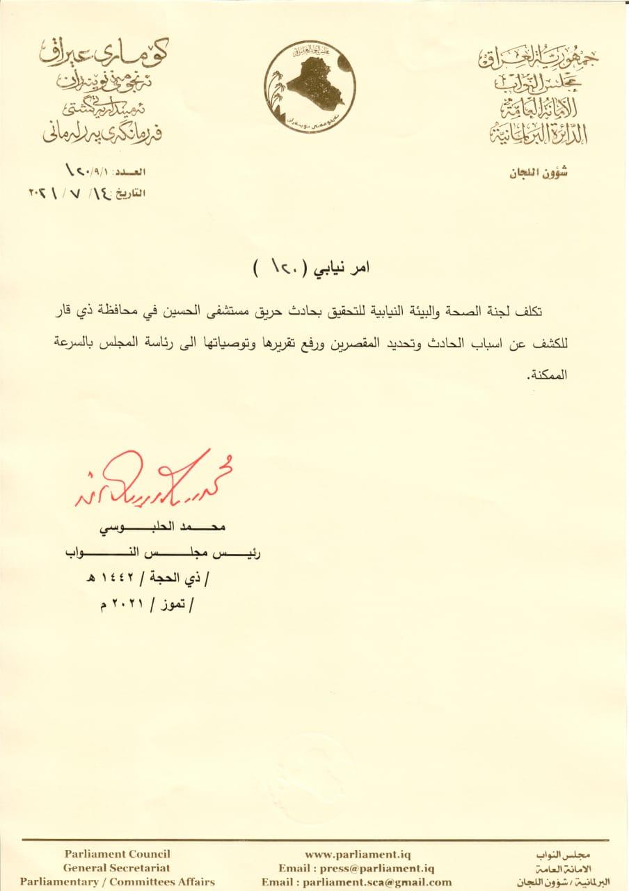 وبحسب وثيقة فان رئاسة البرلمان قررت "تكليف لجنة الصحة والبيئة النيابية، للتحقيق بحادثة حريق مستشفى الحسين في محافظة ذي قار؛ للكشف عن أسباب الحادث ومحاسبة المقصرين ورفع تقريرها وتوصياتها إلى رئاسة المجلس بالسرعة الممكنة".
