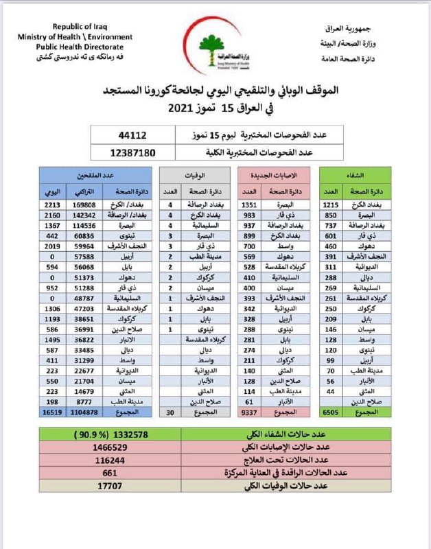 وبحسب الموقف الوبائي، فقد اكدت "الصحة تسجيل 9337 إصابة جديدة بفيروس كورونا خلال الساعات الـ 24 الماضية، ليرتفع بذلك اجمالي الاصابات الى 1466529 اصابة منذ تفشي الوباء في العراق".