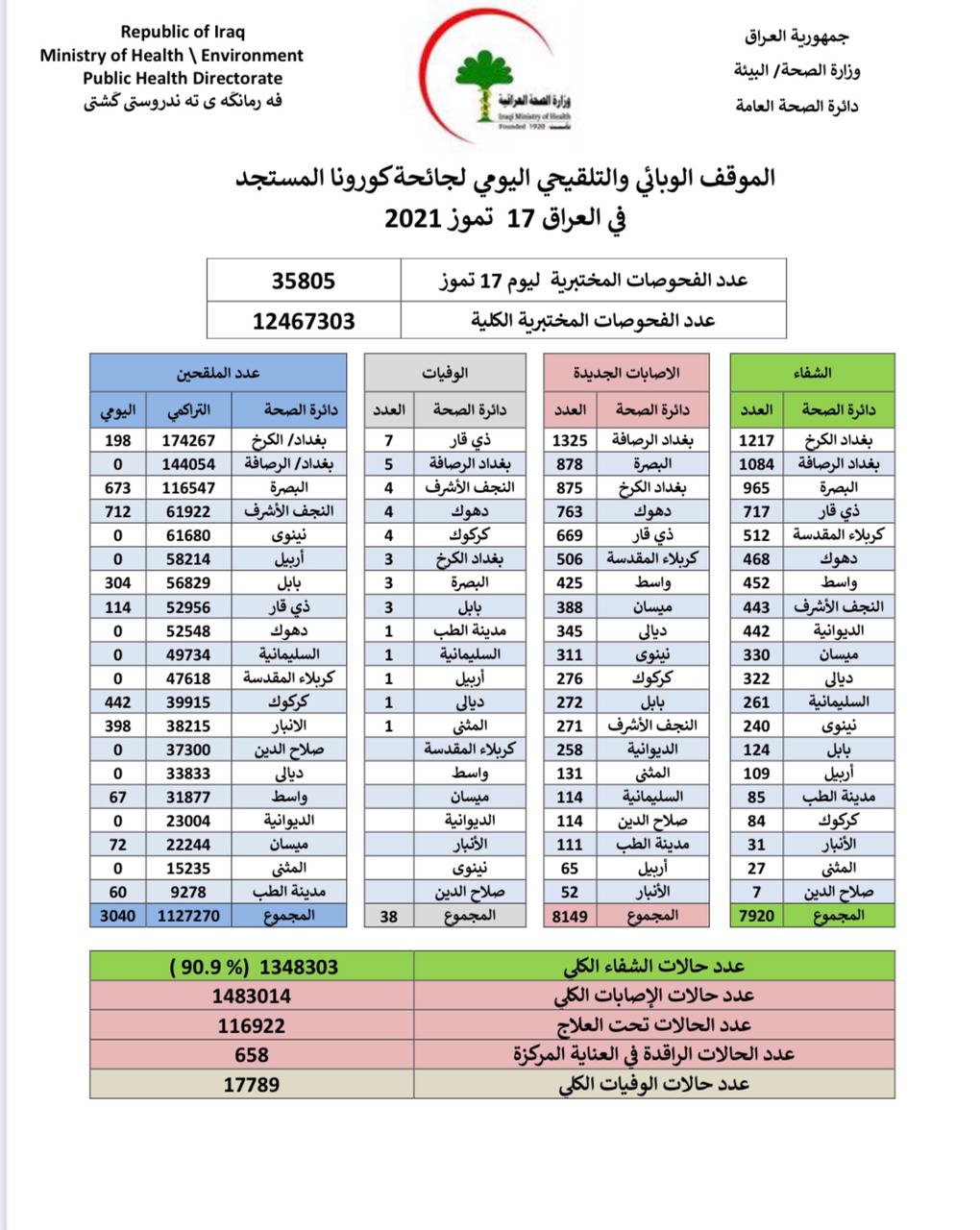 أعلنت وزارة الصحة، اليوم السبت، الموقف الوبائي والتلقيحي اليومي لجائحة كورونا في عموم العراق.