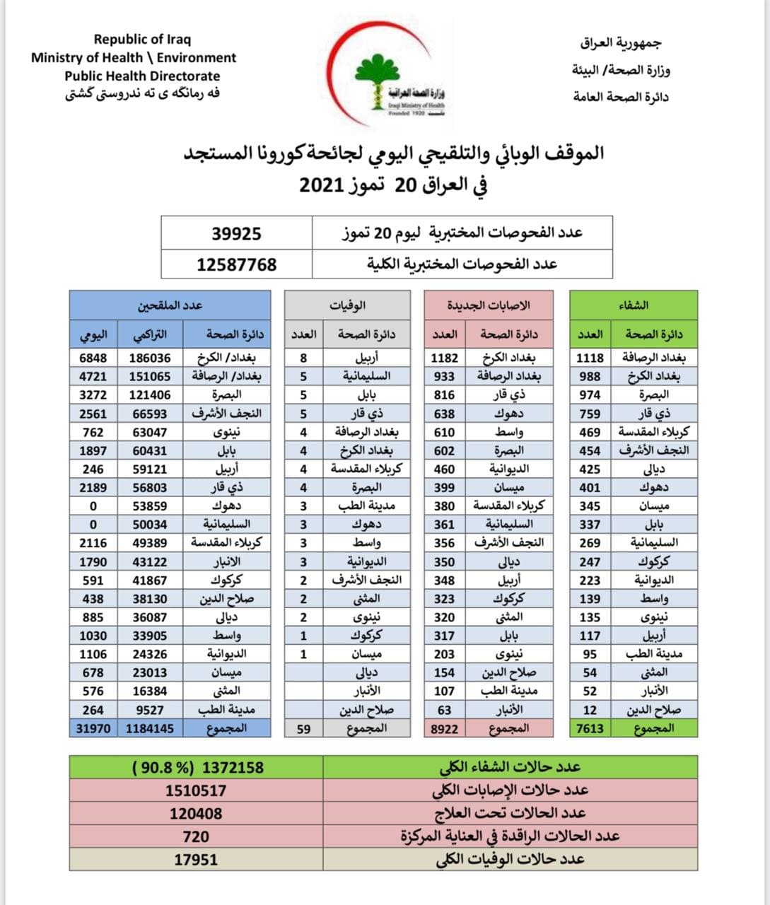 اعلنت وزارة الصحة والبيئة، اليوم الثلاثاء، الموقف الوبائي اليومي لجائحة كورونا في العراق.