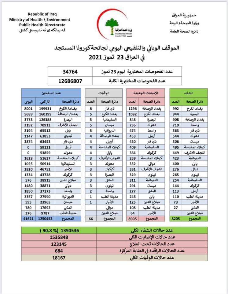 أعلنت وزارة الصحة والبيئة، اليوم الجمعة، الموقف الوبائي اليومي لجائحة كورونا في العراق.