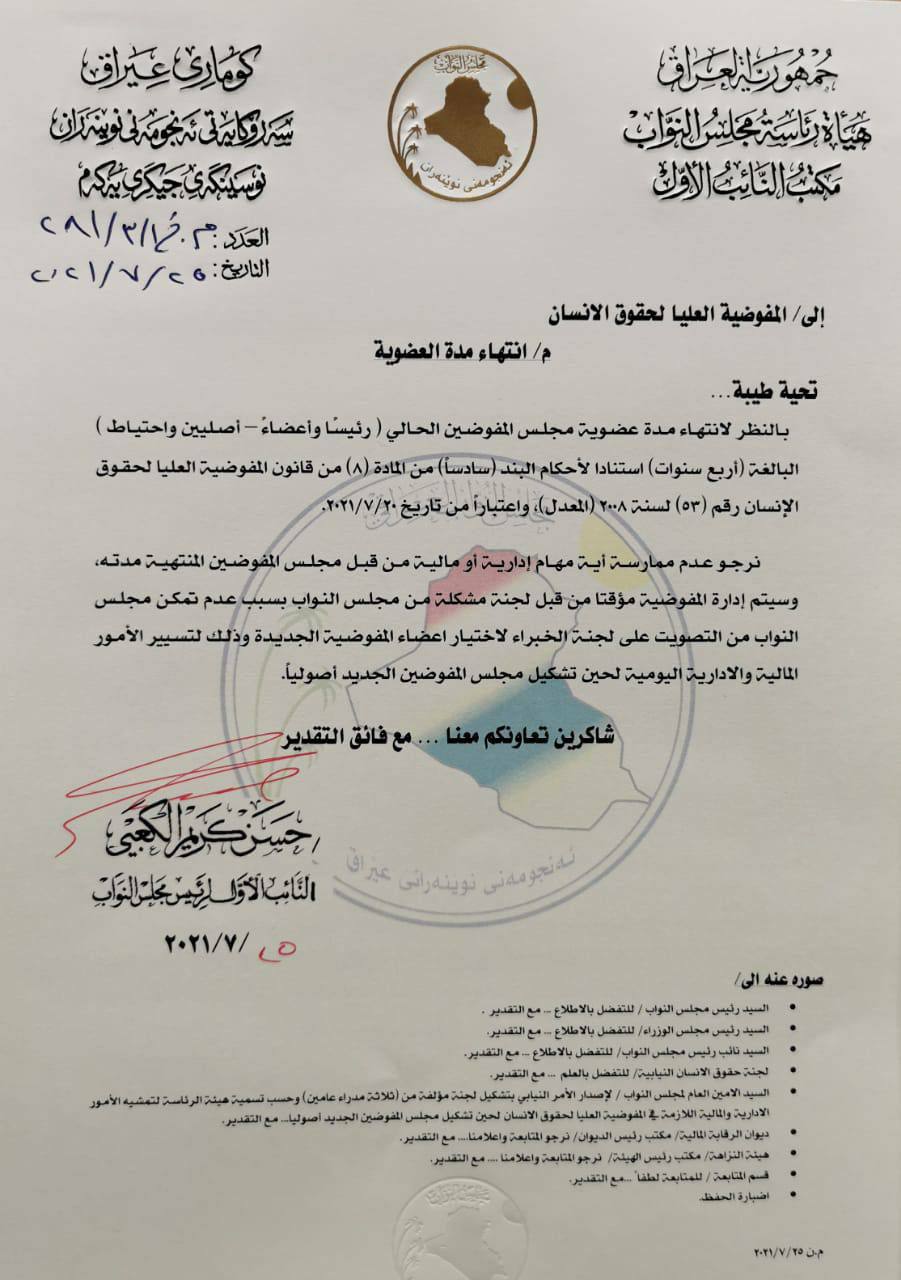 وجاء في وثيقة مذيلة بتوقيع الكعبي، إنه "بالنظر لانتهاء مدة عضوية مجلس المفوضين الحالي (رئيساً وأعضاء، أصليين واحتياط) البالغة 4 سنوات، استناداً لأحكام البند سادساً من المادة 8، من قانون المفوضية العليا لحقوق الإنسان رقم 53 لسنة 2008 المعدل، واعتباراً من تاريخ 20 تموز 2021".