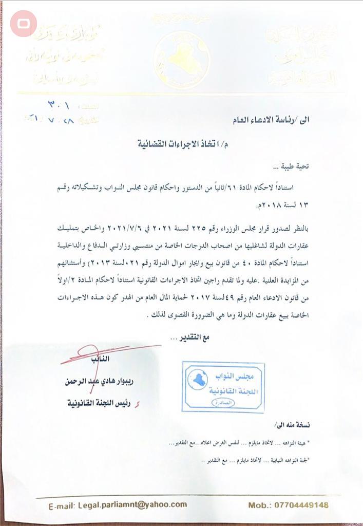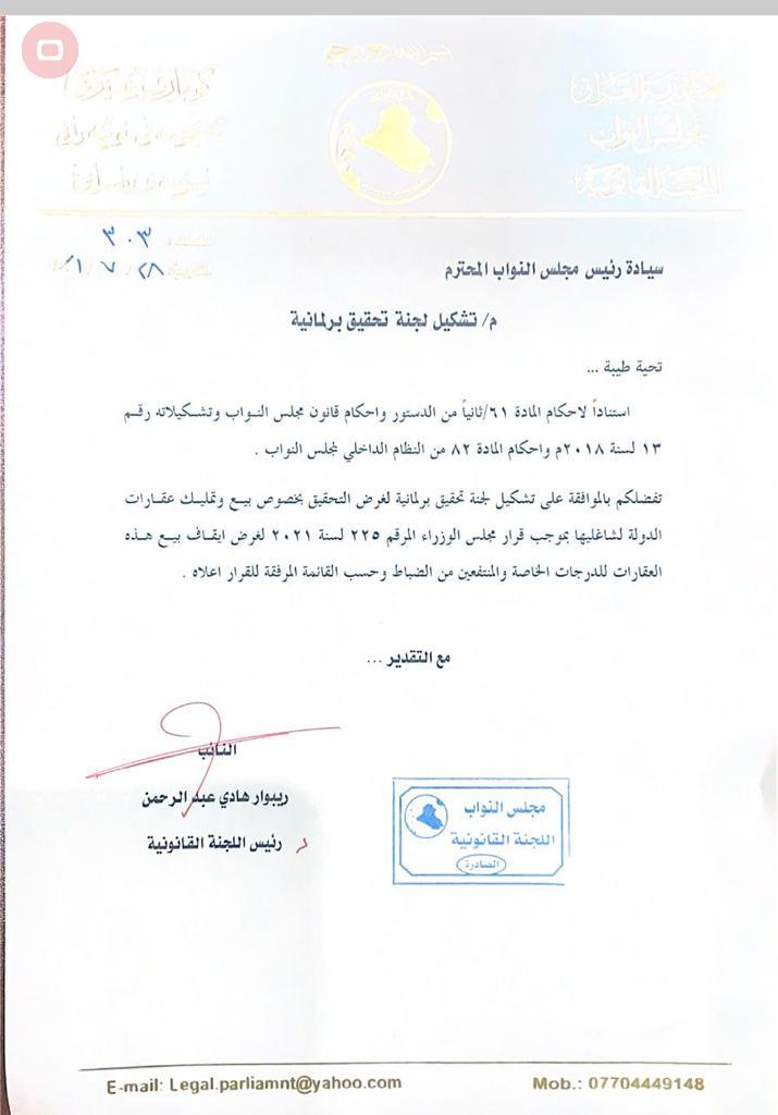 وبحسب وثيقة صادرة من رئيس الللجنة ريبوار هادي "الى رئيس مجلس النواب، تفضلكم بالموافقة على تشكيل لجنة تحقيق برلمانية بخصوص بيع وتمليك عقارات الدولة لشاغليها بموجب قرار مجلس الوزراء المرقم 225 لسنة 2021 لغرض ايقاف بيع هذه العقارات للدرجات الخاصة والمنتفعين من الضباط".