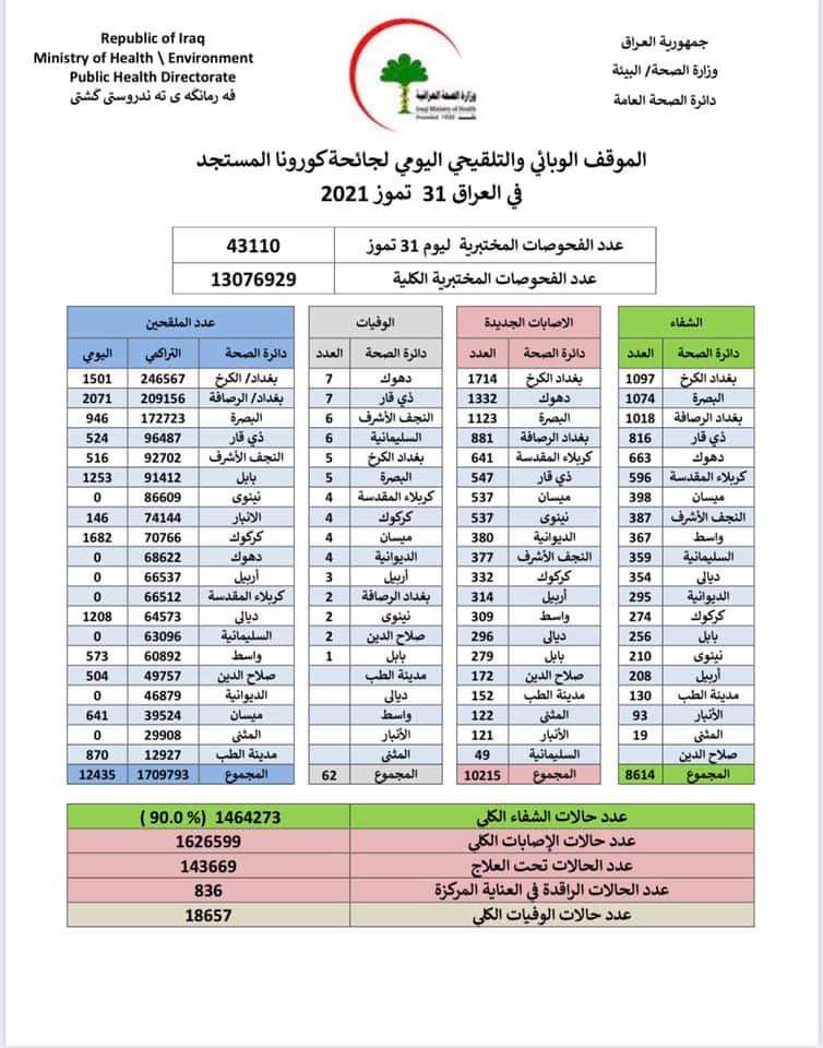 أعلنت وزارة الصحة، اليوم السبت، الموقف الوبائي الخاص بجائحة كورونا في عموم العراق.