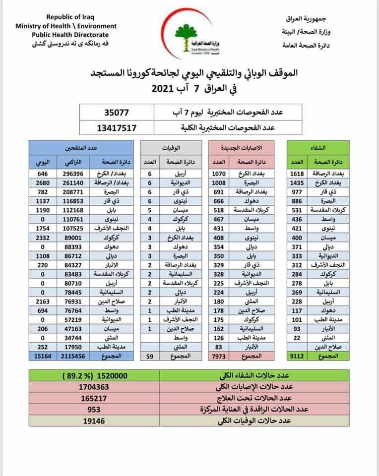 الموقف الوبائي والتلقيحي اليومي لجائحة كورونا في العراق ليوم السبت الموافق ٧ اب ٢٠٢١