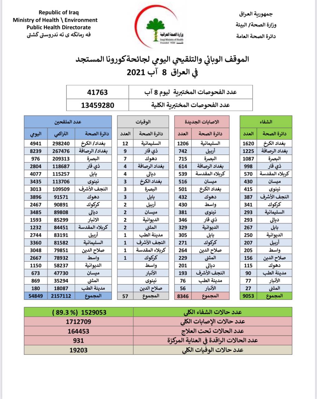 أعلنت وزارة الصحة، اليوم الأحد، الموقف الوبائي والتلقيحي اليومي لجائحة كورونا في عموم العراق.