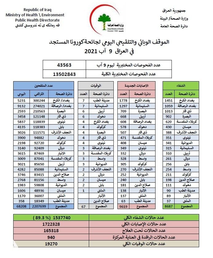 أعلنت الوزارة الصحة، اليوم الاثنين، الموقف الوبائي اليومي الخاص بجائحة كورونا في عموم العراق.