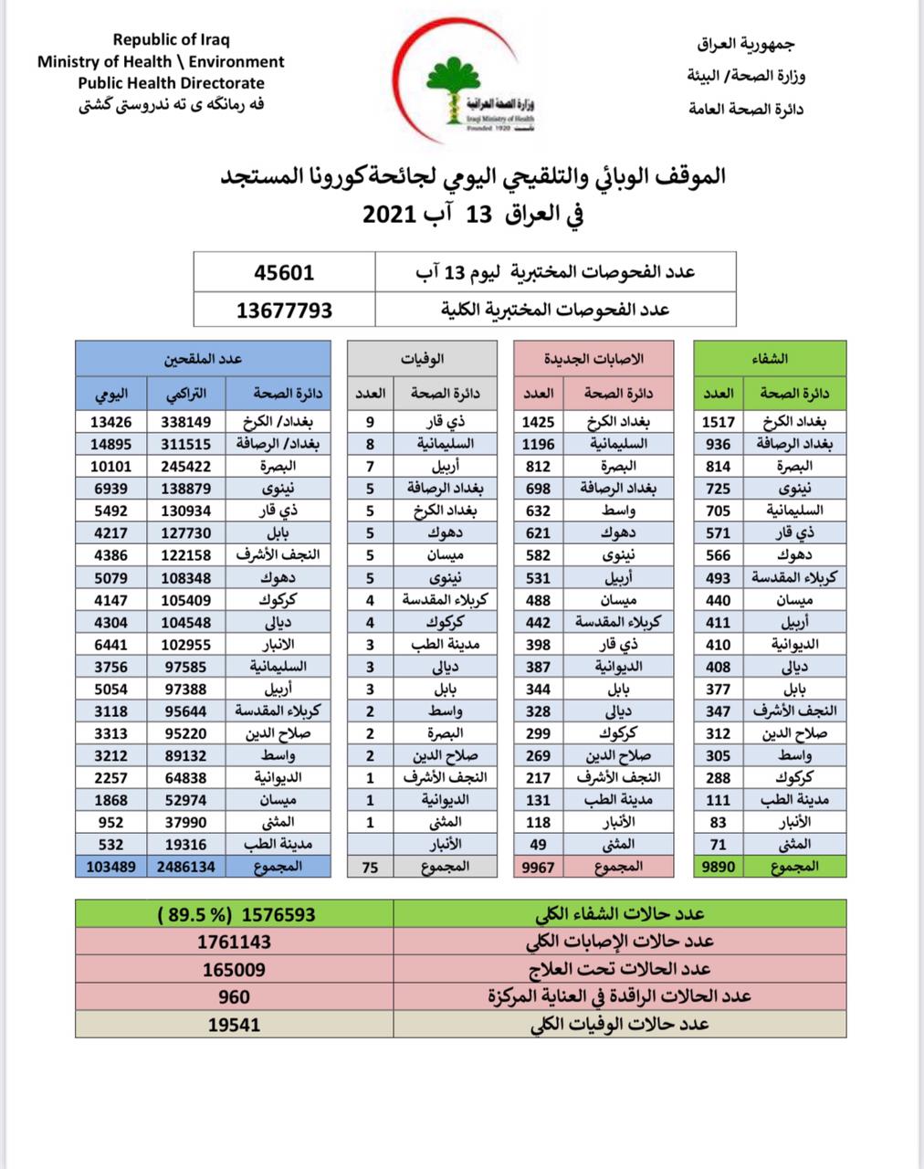 أعلنت وزارة الصحة، اليوم الجمعة، الموقف الوبائي والتلقيحي اليومي لجائحة كورونا في العراق.
