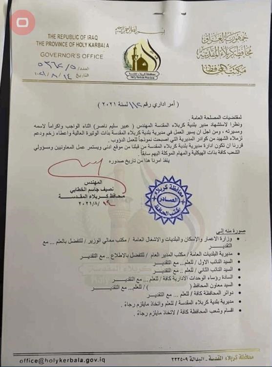 وبحسب وثيقة صادرة عن الخطابي ، فإن القرار جاء لتسهيل تسيير العمل في مديرية بلدية كربلاء وتكريما للشهيد عبير وزملاءه.