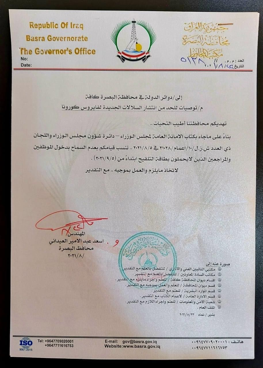 وجهت حكومة البصرة المحلية، اليوم الاحد، دوائر الدولة في المحافظة بعدم السماح بدخول الموظفين والمراجعين الذين لايحملون بطاقة التلقيح ابتداءً من الخامس من أيلول المقبل.