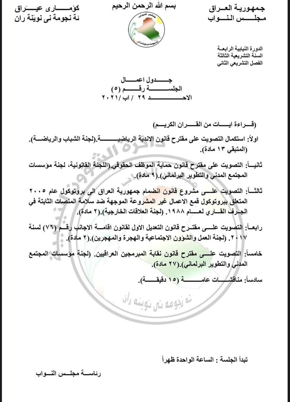 اعلنت الدائرة الاعلامية لمجلس النواب العراقي، اليوم الخميس، عن جدول اعمال جلسة يوم الاحد المقبل.