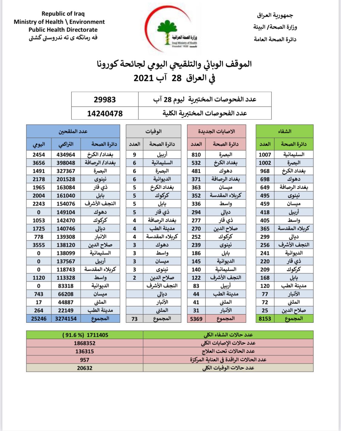 أعلنت وزارة الصحة، اليوم السبت، الموقف الوبائي اليومي لجائحة كورونا في عموم العراق.