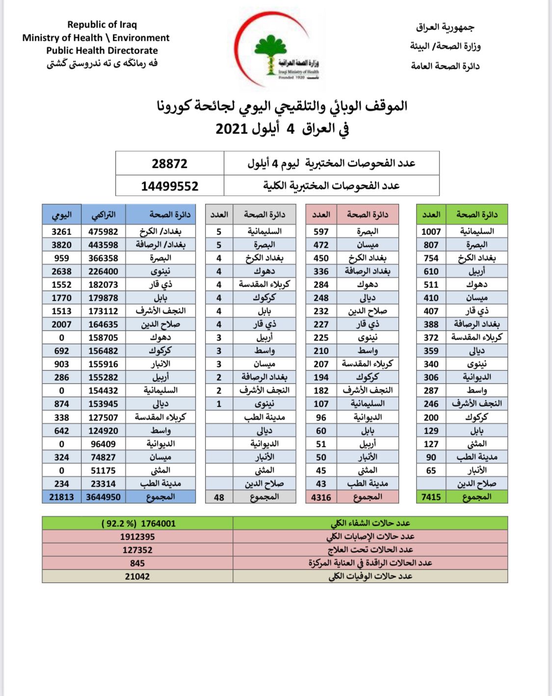 أعلنت وزارة الصحة، اليوم السبت، الموقف الوبائي والتلقيحي اليومي لجائحة كورونا في العراق.