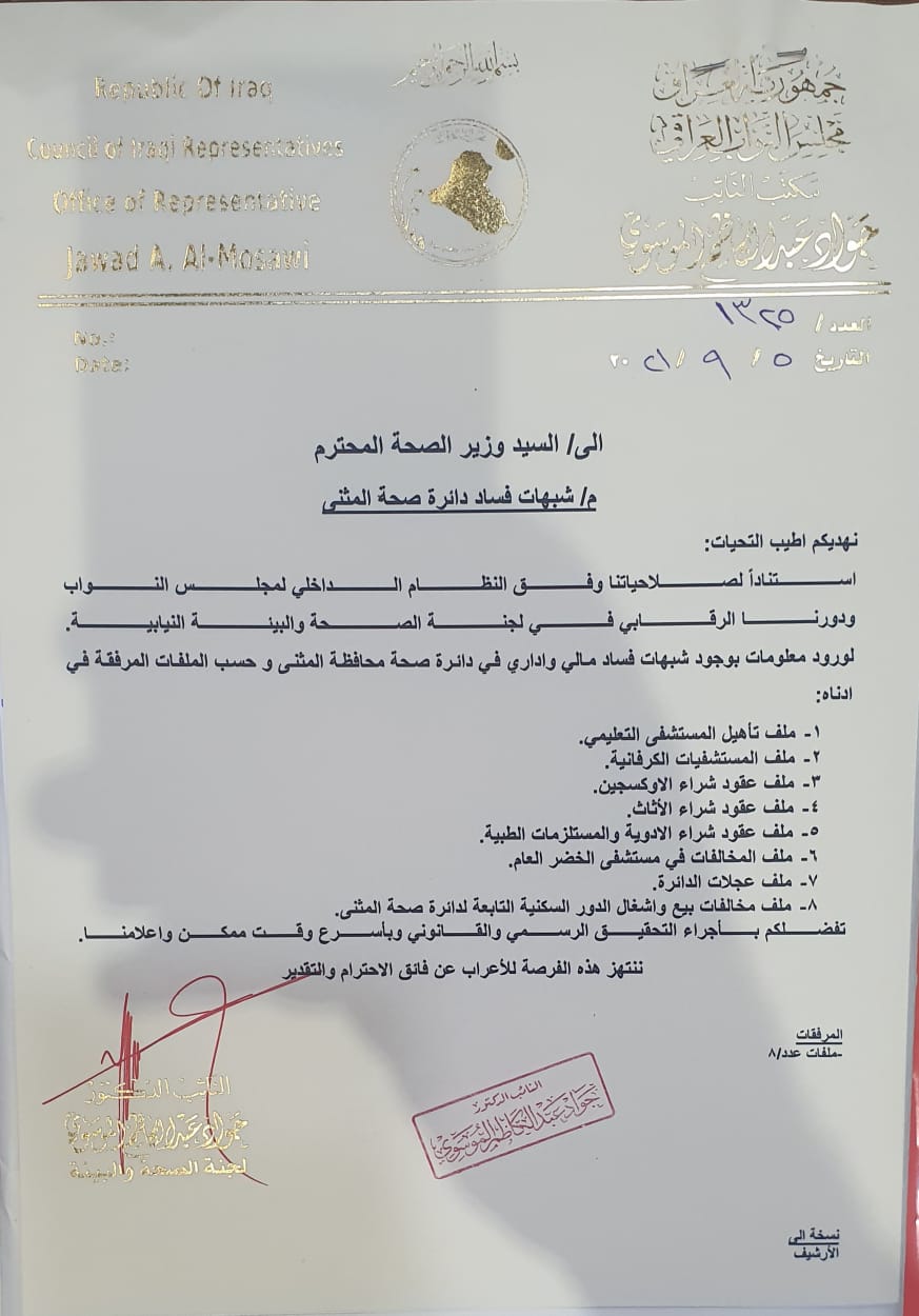 كشف النائب جواد الموسوي، اليوم السبت، عن وجود شبهات فساد اداري ومالي في دائرة صحة المثنى تتجاوز قيمتها العشرة مليار دينار في ثمان ملفات.