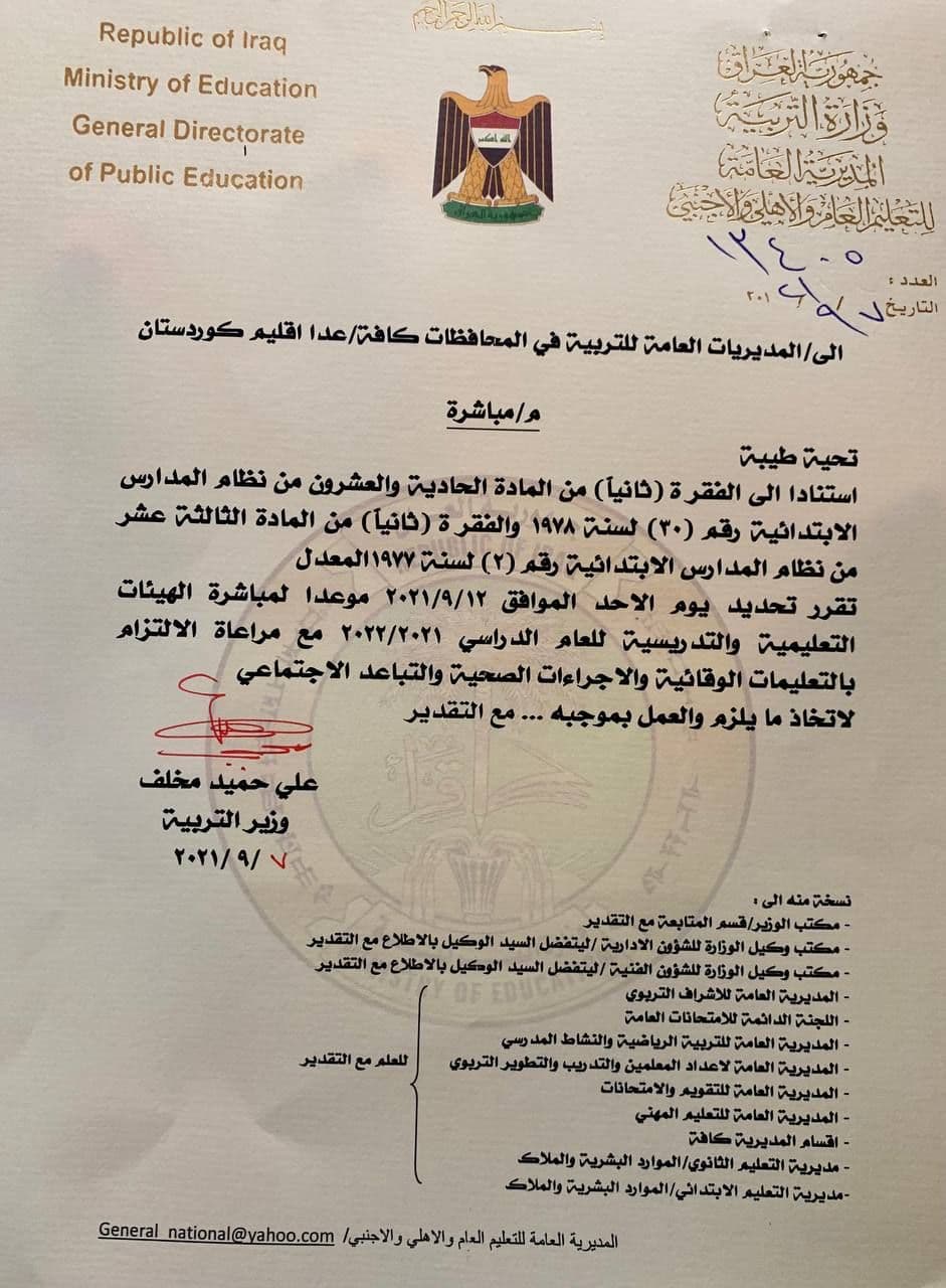واضافت أن "المديرية العامة للتعليم العام والأهلي والأجنبي وجهت المديريات العامة للتربية في المحافظات كافة / عدا إقليم كردستان، باعتماد يوم الأحد الموافق الـ 12 من أيلول الجاري ، موعداً لمباشرة الملاكات التعليمية والتدريسية في المدارس، مع الأخذ بضرورة مراعاة الالتزام بالتعليمات الوقائية والصحية، وكذلك التقيد بالتباعد الاجتماعي".