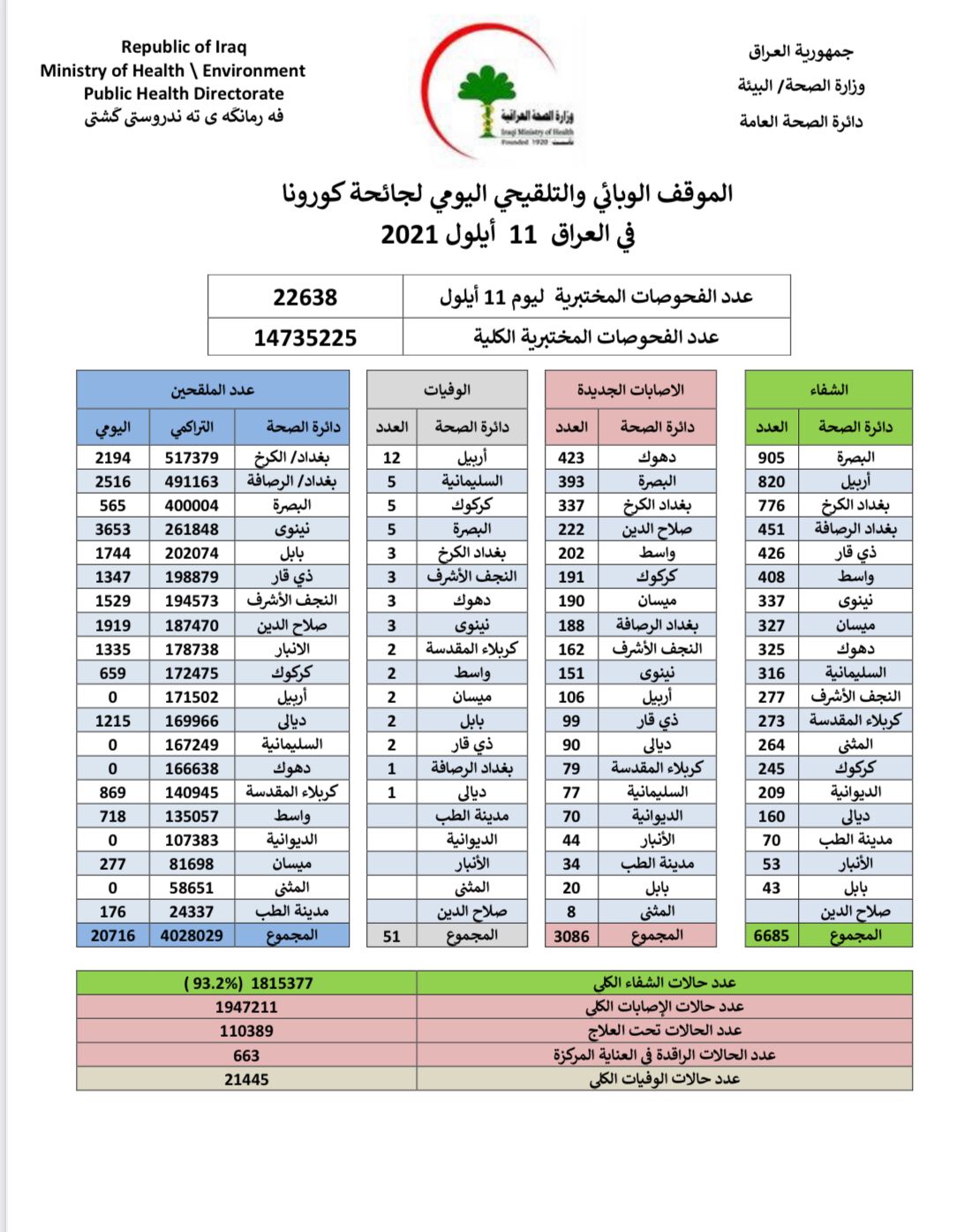 أعلنت وزارة الصحة، اليوم السبت، الموقف الوبائي والتلقيحي اليومي لجائحة كورونا في العراق.
