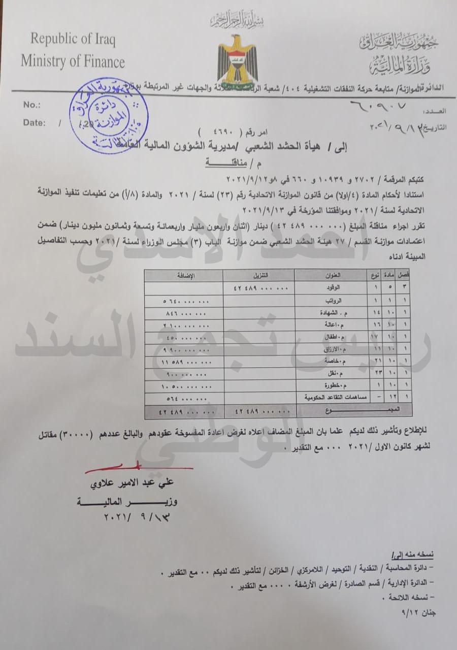وقال التحالف في بيان مقتضب، إنه "تم اصدار كتاب من وزارة المالية يقضي بارجاع المفسوخة عقودهم في هيئة الحشد الشعبي بما يقدر اكثر من ثلاثين الف مقاتل".