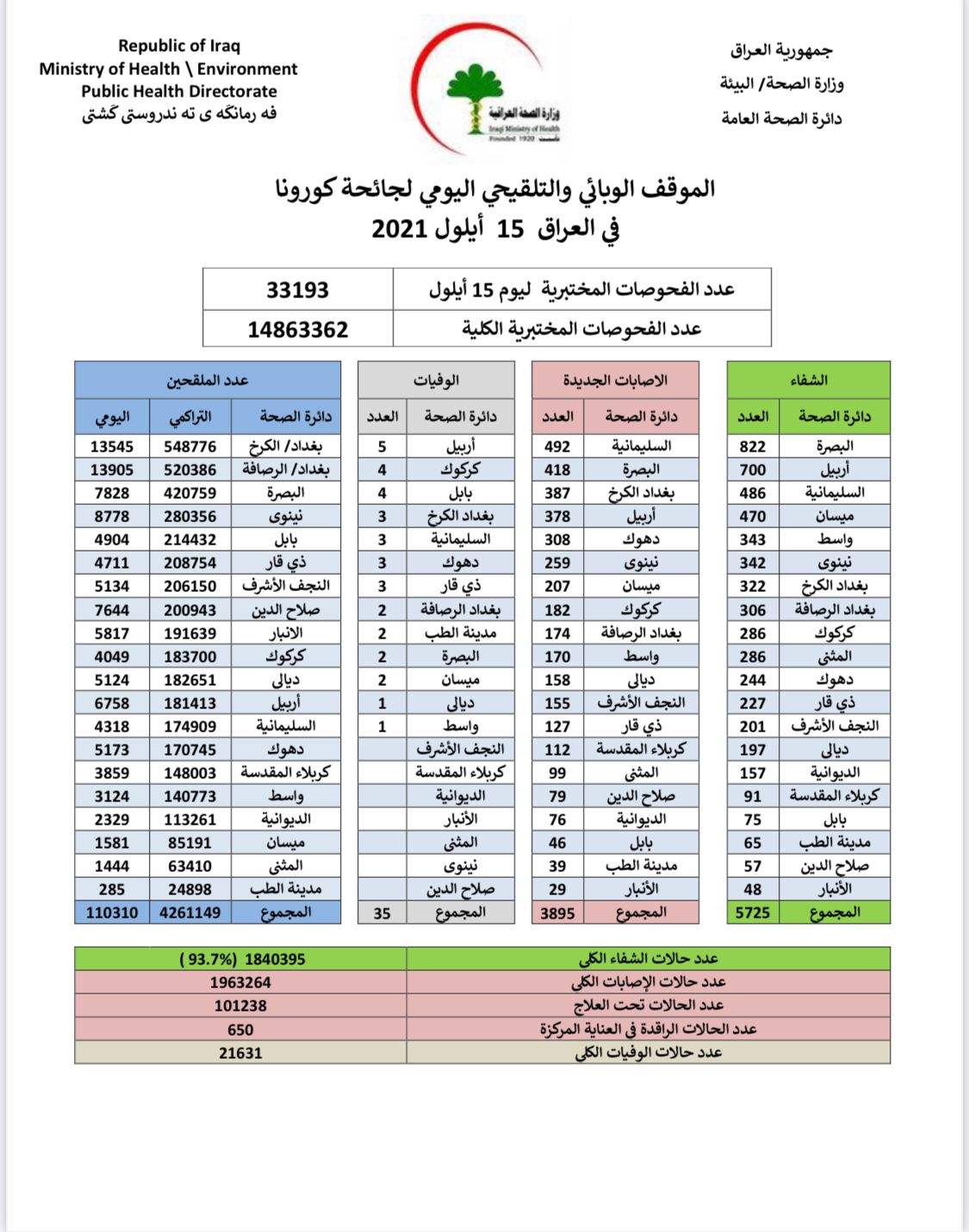 أعلنت وزارة الصحة، اليوم الاربعاء، الموقف الوبائي والتلقيحي اليومي لجائحة كورونا في العراق.