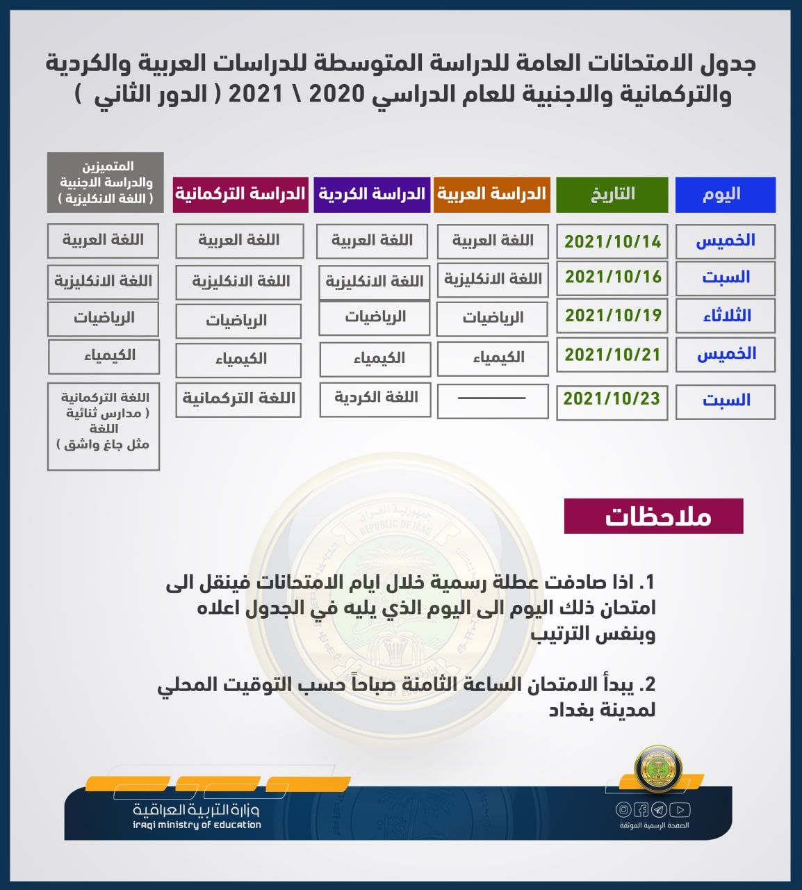 اعلنت وزارة التربية، اليوم الخميس، عن استحصال موافقة مجلس الوزراء على تأجيل امتحانات الدور الثاني لطلبة الثالث المتوسط الى يوم الخميس الموافق ١٤ تشرين الاول بدلاً من الثاني من ذات الشهر .