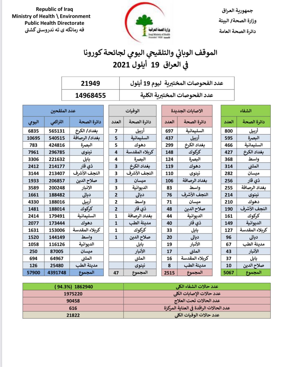 أعلنت وزارة الصحة، اليوم الاحد، الموقف الوبائي والتلقيحي اليومي لجائحة كورونا في العراق.