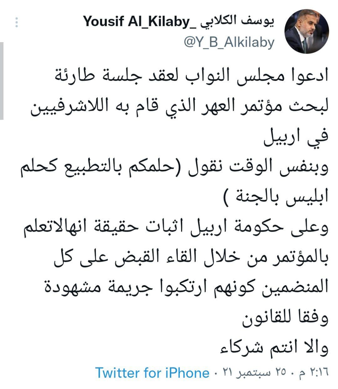 بالتغريدة … الكلابي يدعو لعقد جلسة برلمان طارئة بشأن مؤتمر التطبيع في اربيل