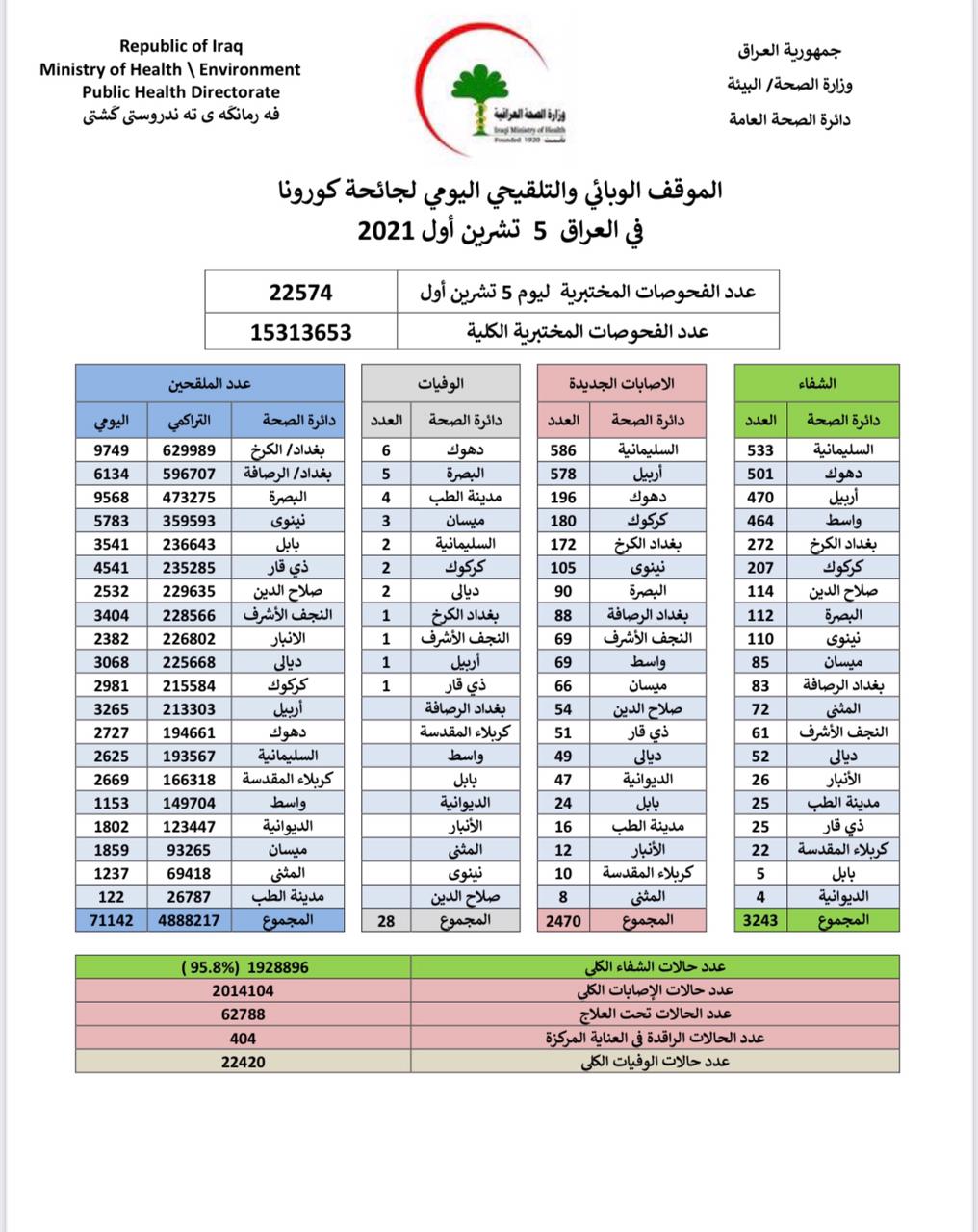 أعلنت وزارة الصحة، اليوم الثلاثاء، الموقف الوبائي والتلقيحي اليومي لجائحة كورونا في العراق.