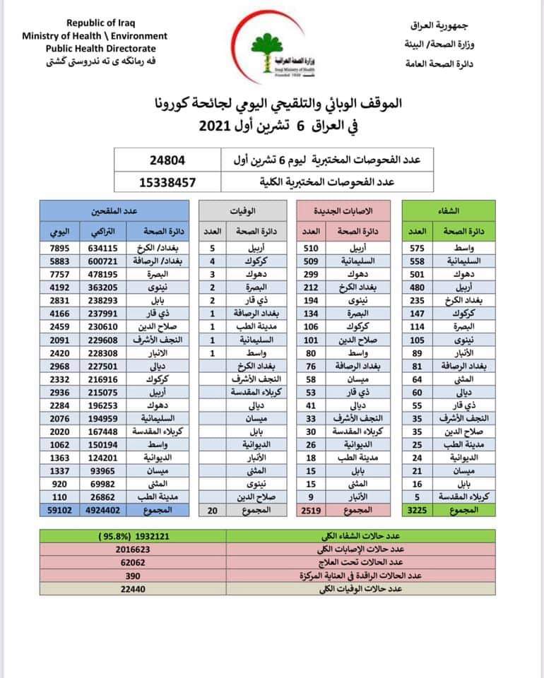 أعلنت وزارة الصحة، اليوم الأربعاء، الموقف الوبائي الخاص بجائحة كورونا في عموم العراق.