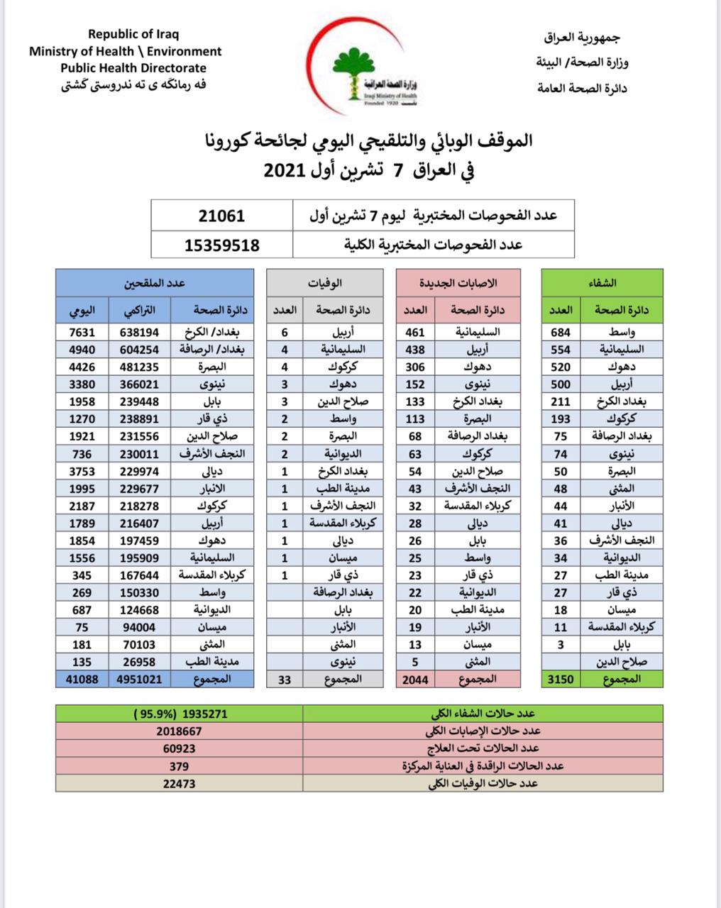 أعلنت وزارة الصحة العراقية، الخميس، عن الموقف الوبائي لفايروس كورونا في عموم العراق.