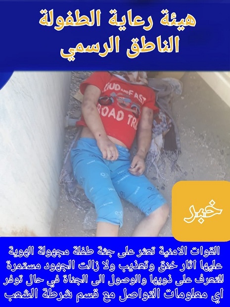 أعلن الناطق الرسمي باسم هيئة رعاية الطفولة المقدم عزيز ناصر، اليوم الخميس، العثور على جثة مجهولة الهوية تعود لطفلة تعرضت للتعذيب والخنق في العاصمة بغداد.