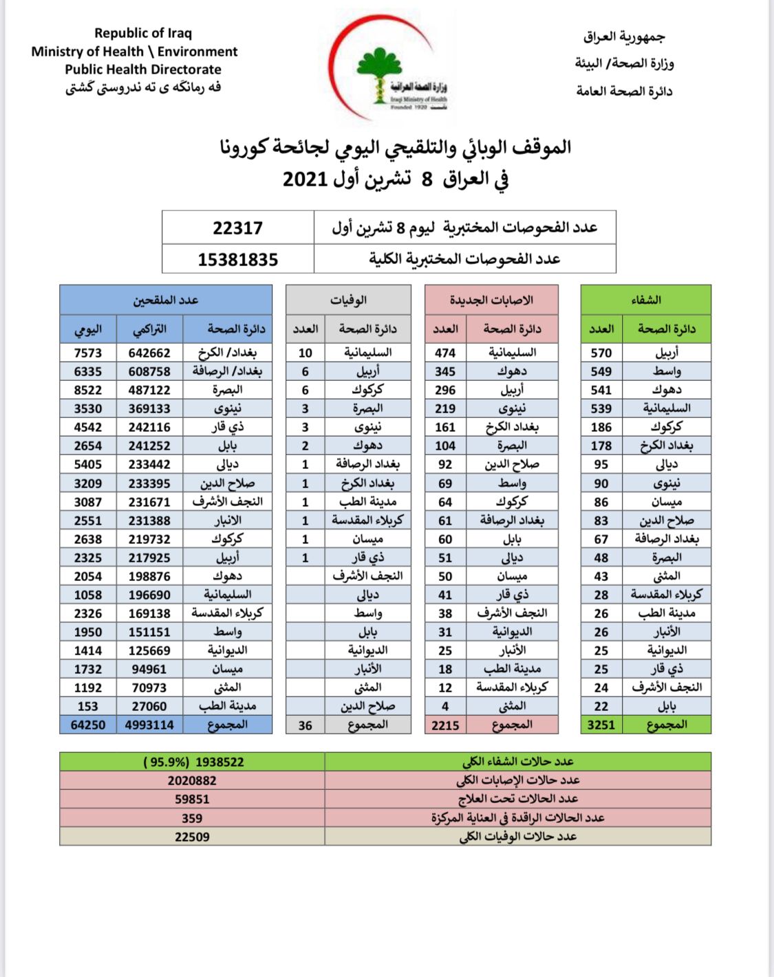 أعلنت وزارة الصحة، اليوم الجمعة، الموقف الوبائي لجائحة كورونا في العراق.