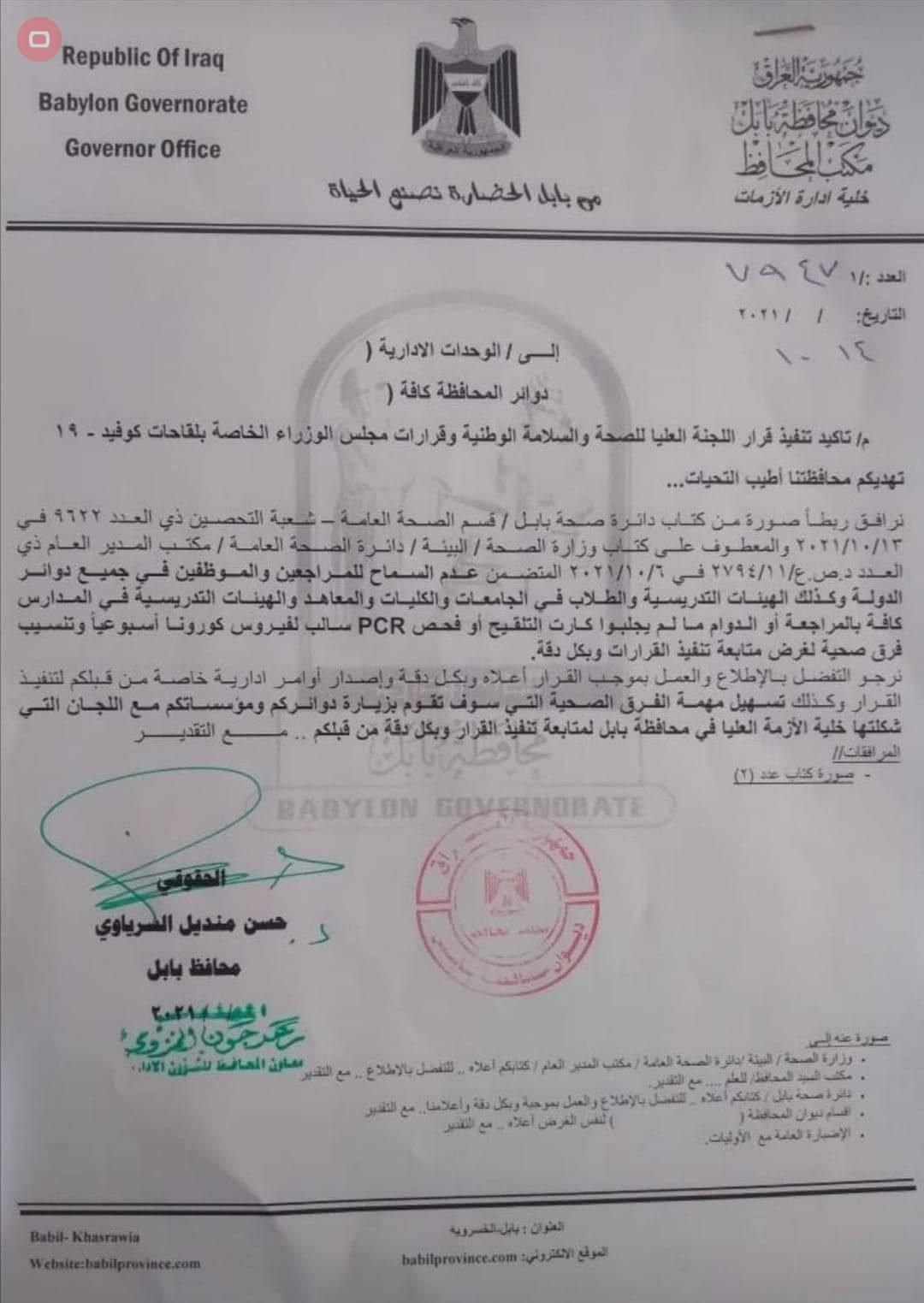 وبحسب وثيقة صادرة من المحافظة نصت على أن"محافظ بابل حسن منديل السرياوي وجه كتاباً إلى جميع دوائر الدولة بعدم السماح للمراجعين والموظفين في جميع دوائر الدولة ،وكذلك الهيئات التدريسية والطلاب في الجامعات والهيئات التدريسية في المدارس ما لم يجلبوا كارت التلقيح أو فحص PCR سالب لفيروس كورونا أسبوعياً".