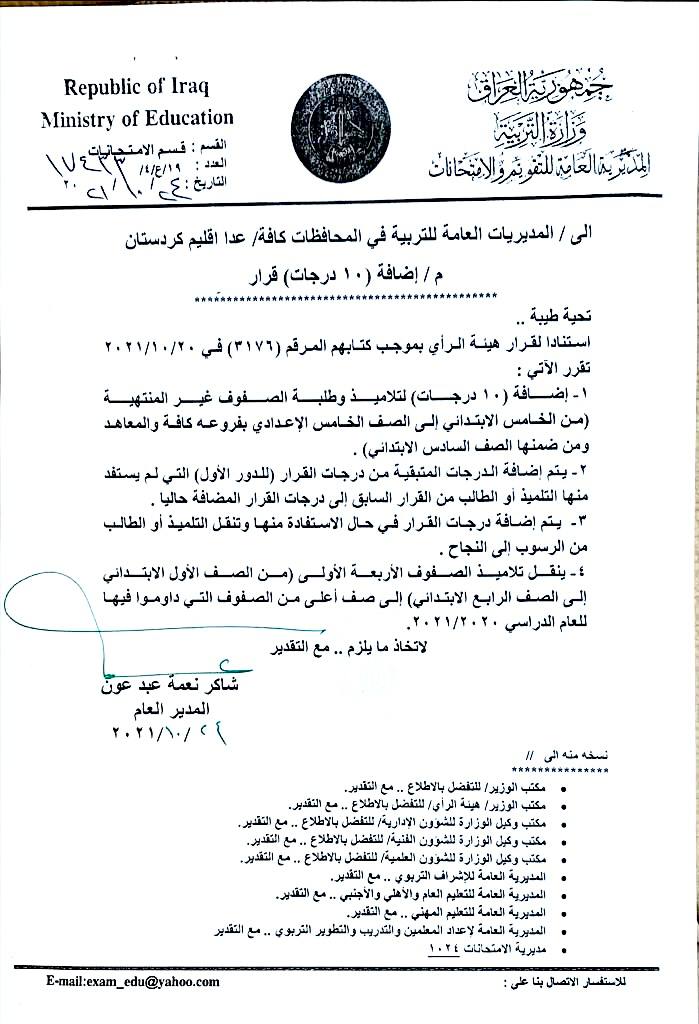 وجاء في وثيقة عن المديرية العامة للتقويم والامتحانات في الوزارة، إنه "تقرر إضافة 10 درجات للتلاميذ وطلبة الصفوف غير المنتهية من الخامس الابتدائي إلى الخامس الاعدادي بفروعه كافة، والمعاهد ومن ضمنها الصف السادس الابتدائي".