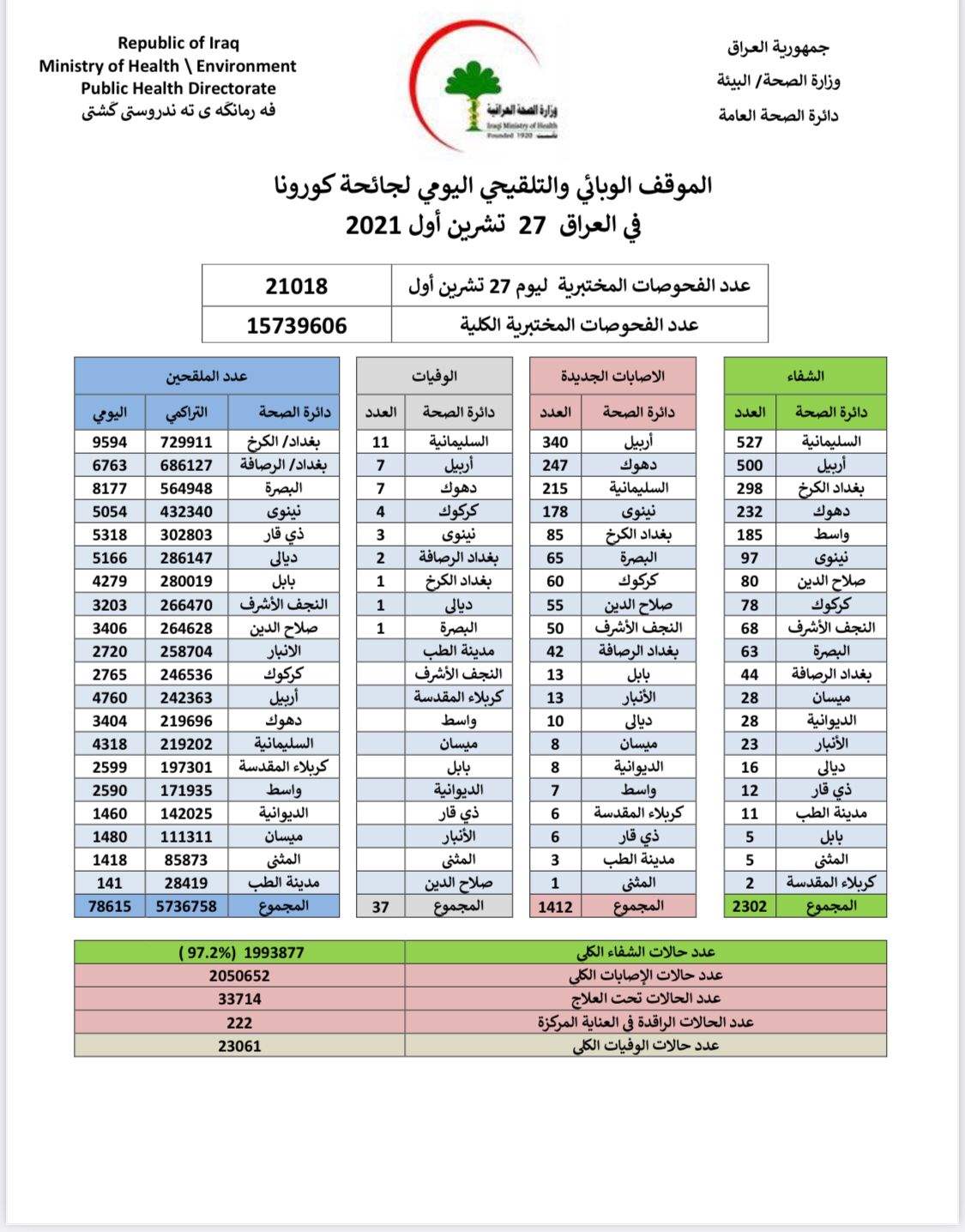 الصحة تعلن الموقف الوبائي لجائحة كورونا في العراق
