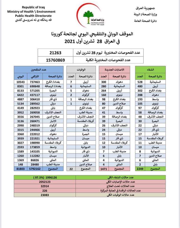 وذكرت الوزارة في بيان أن "كوادرها الصحية سجلت 1471 إصابة جديدة بفيروس كورونا مقابل تماثل 2249 حالة للشفاء، و22 وفاة".