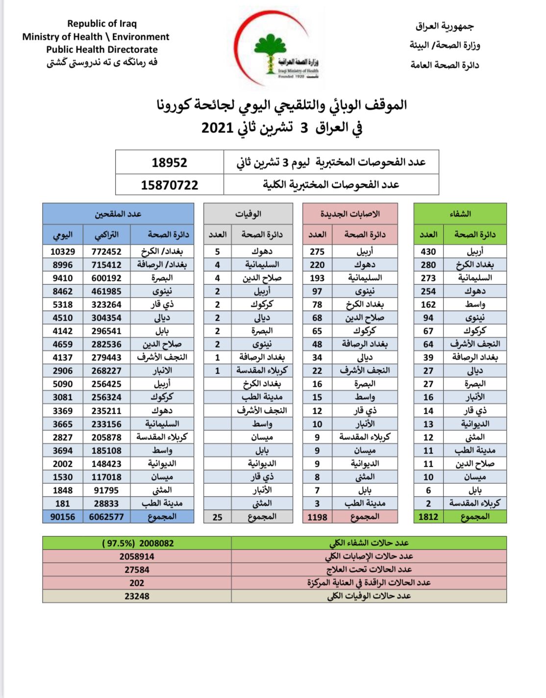 وبحسب الموقف الوبائي اليومي الذي اصدرته الصحة فقد "سجل العراق 1198 اصابة جديدة بفيروس كورونا و 25 حالة وفاة خلال الساعات الـ 24 الماضية".