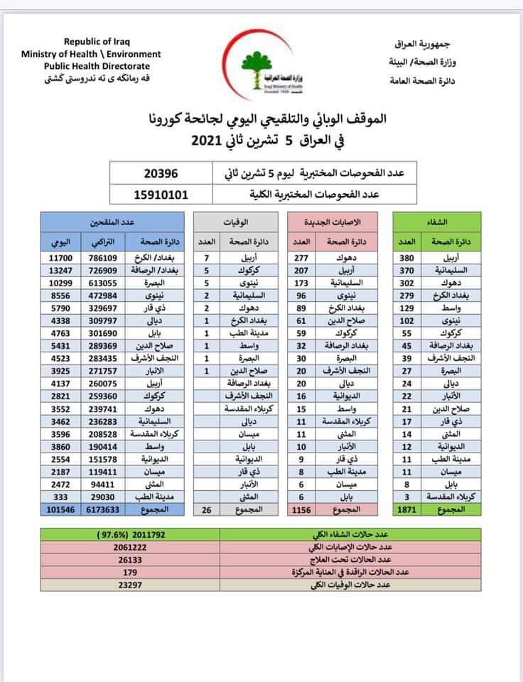 وذكرت الوزارة في بيان ، أن "كوادرها الصحية سجلت في عموم المحافظات العراقية 1156 إصابة جديدة، فيما تماثل 1871 مصاباً إلى الشفاء، وقابل ذلك وفاة 26 مصاباً خلال المدة المذكورة".