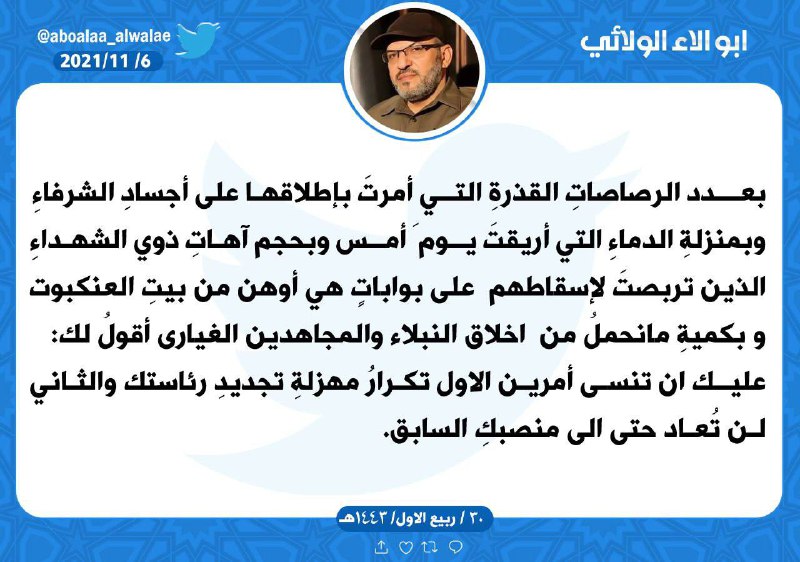 خاطب الامين العام لكتائب سيد الشهداء ابو الاء الولائي رئيس الوزراء المنتهية ولايته المدعو مصطفى عبد اللطيف مشتت ردا على المجزرة الشنيعة التي اقترفها جلاوزته يوم امس بحق المتظاهرين السلميين الذين رفضوا نتائج الانتخابات المزورة البائسة