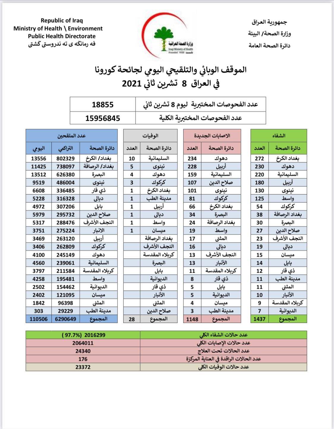 وقالت الوزارة في بيان إن كوادرها "سجلت 1148 إصابة، و 1437 حالة شفاء، فيما تم تسجيل 28 حالة وفاة جديدة بكورونا".