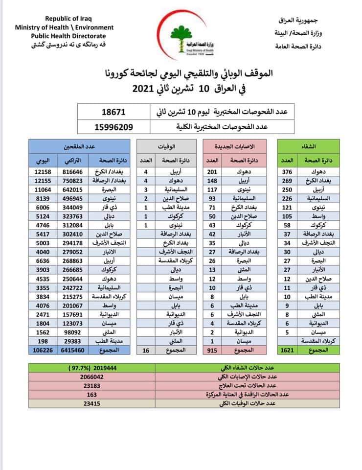 وقالت الوزارة في بيان إن "كوادرها سجلت 915 إصابة جديدة، مقابل تماثل 1621 حالة للشفاء، وتسجيل 16 حالة وفاة".