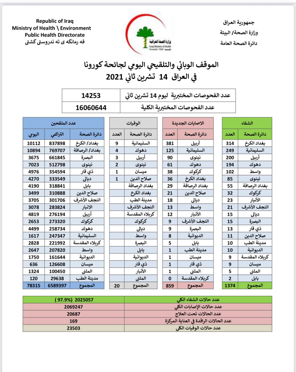 أعلنت وزارة الصحة، اليوم الأحد، الموقف الوبائي لجائحة كورونا في عموم العراق.