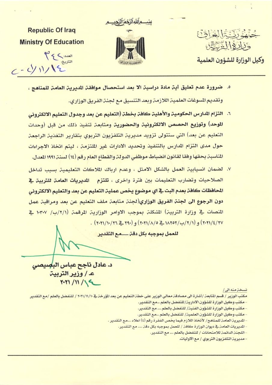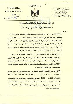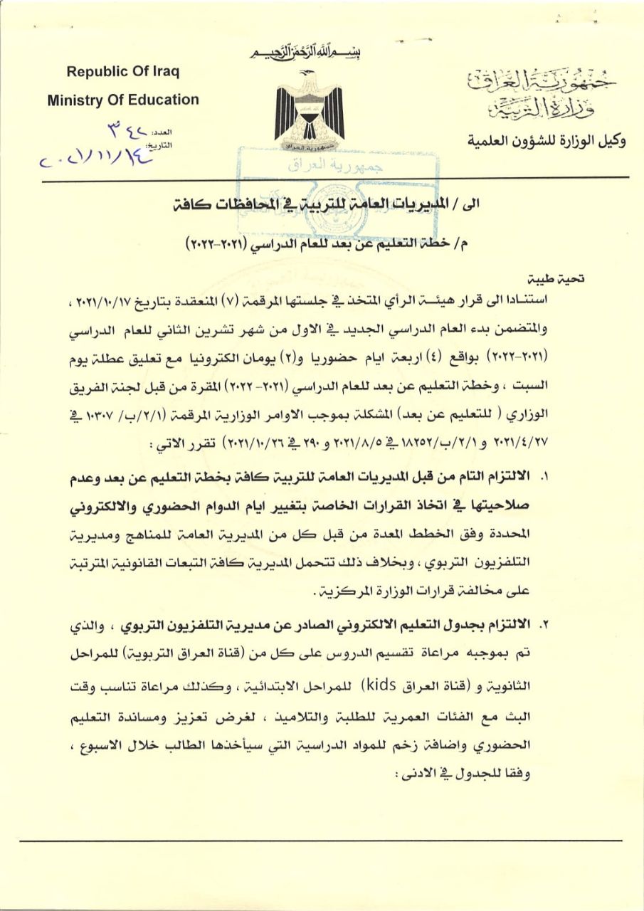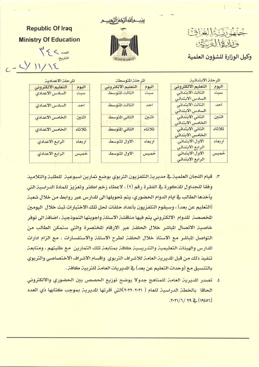 وذكر بيان للوزارة إن "الخطة تتضمن ضوابط لكافة المديريات العامة للتربية في بغداد والمحافظات وللمدارس الاهلية منها والحكومية بالجداول المعتمدة ضمن الخطة لأيام الدوام (الحضوري والالكتروني) وفق الخطط المعدة من قبل كل من المديرية العامة للمناهج ومديرية التلفزيون التربوي، لضمان انسيابية العمل بالشكل الأمثل فضلا عن تلافي الارباك الذي قد يحصل وينعكس سلباً على التلاميذ والطلبة بصورة عامة".