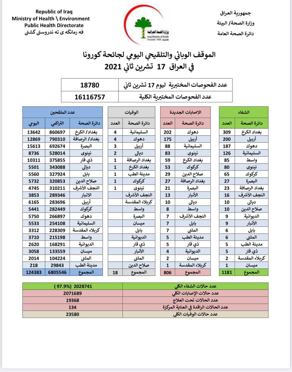 وقالت الوزارة في بيان إن كوادرها سجلت "806 إصابة جديدة، و 1181 حالة شفاء، مع تسجيل 18 حالة وفاة بالفيروس".