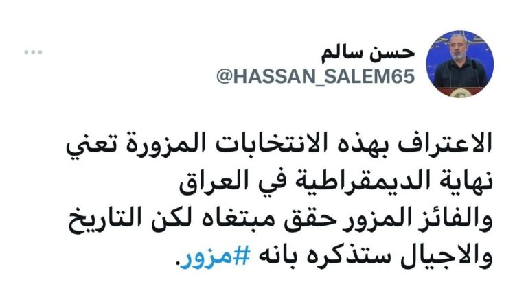تغريدة.. حسن سالم: الاعتراف بالانتخابات يعني نهاية الديمقراطية في العراق