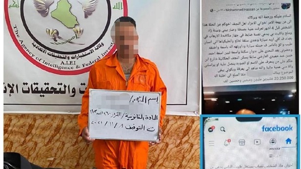 وذكرت الخلية في بيان انه "بعملية استخباراتية مهنية تكللت بالنجاح، وبعد ورود مناشدة بوجود أحد المتهمين ينتحل صفة ضابط برتبة رائد يقوم بابتزاز المواطنين في محافظتي النجف وبابل، على الفور تم تشكيل فريق عمل مختص من وكالة الاستخبارات والتحقيقات الاتحادية، وبعد استحصال الموافقات القضائية ومتابعة الهدف تم القبض على المتهم في محافظة النجف الأشرف بالجرم المشهود بحوزته هويات مزورة تحمل رتبة رائد، ومسدس غير مرخص، وزي عسكري، وإجازة سوق مزورة".