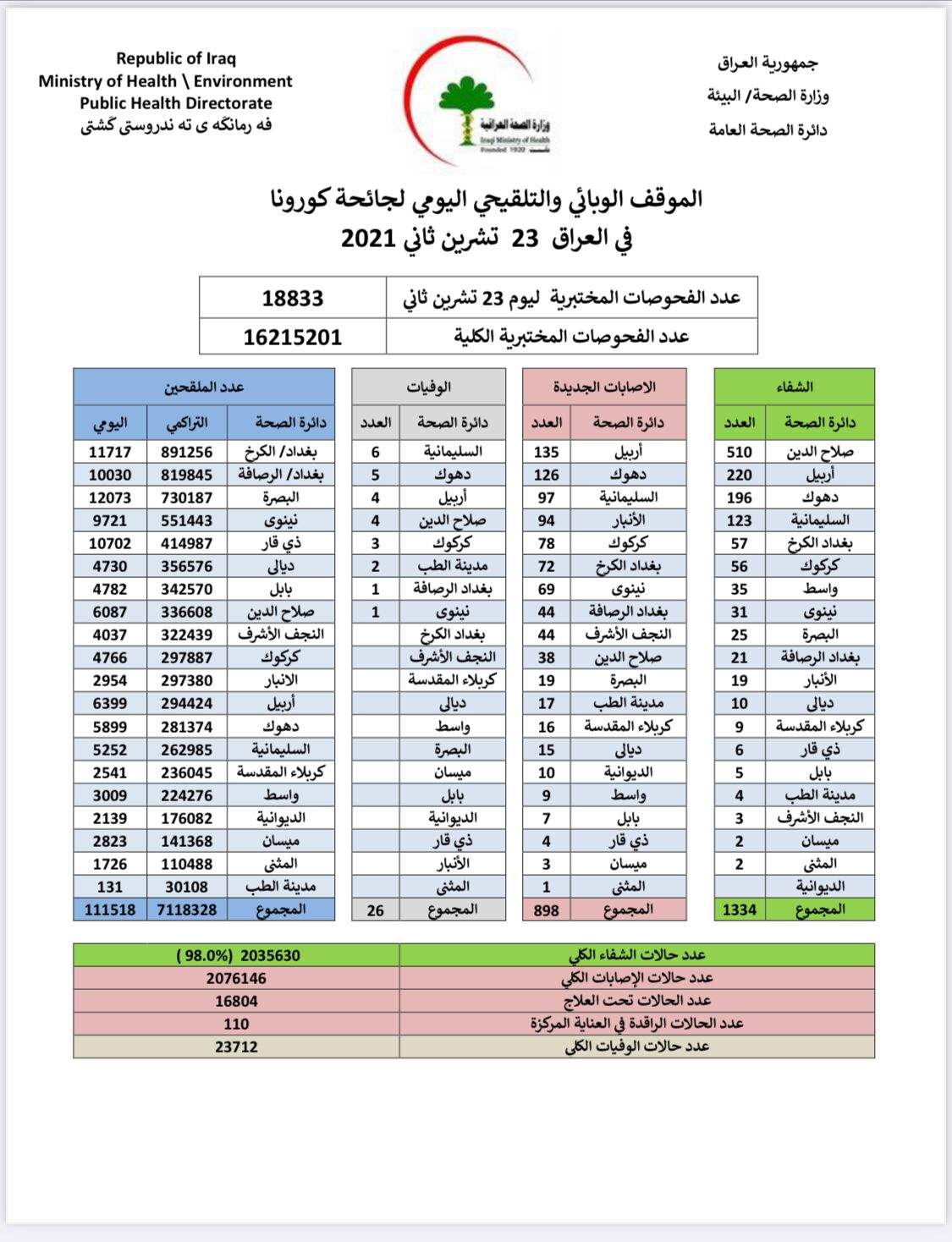 أعلنت وزارة الصحة، اليوم الثلاثاء، الموقف الوبائي والتلقيحي اليومي لجائحة كورونا في العراق.