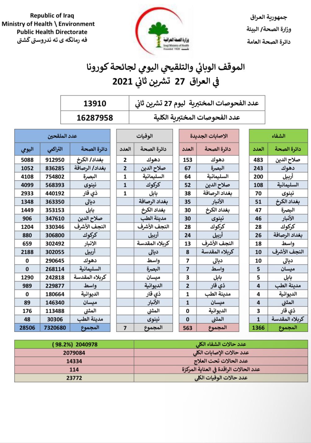 أعلنت وزارة الصحة، اليوم السبت، الموقف الوبائي لجائحة كورونا في عموم العراق.